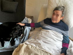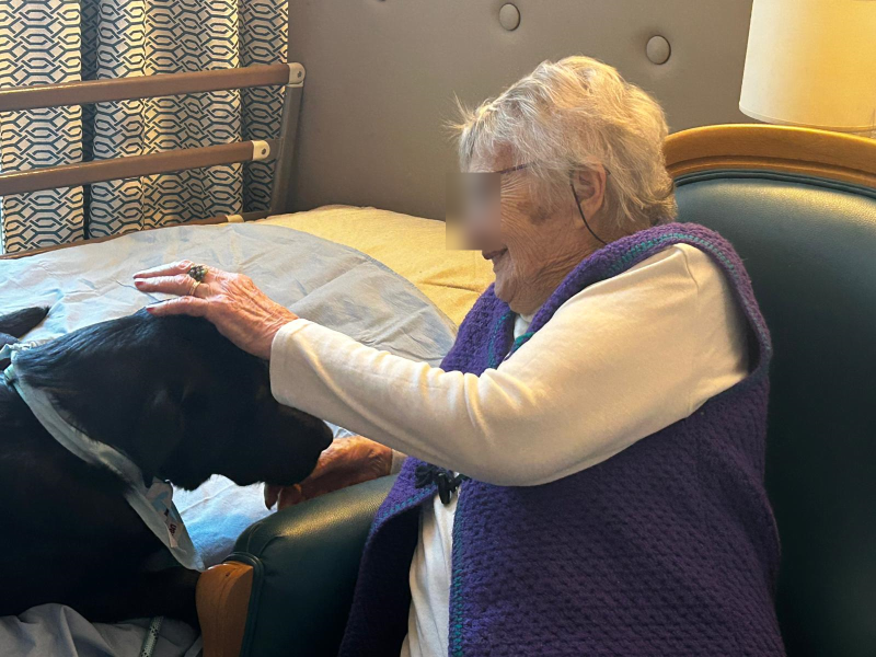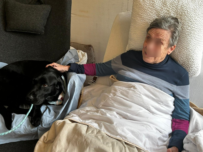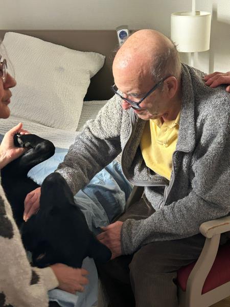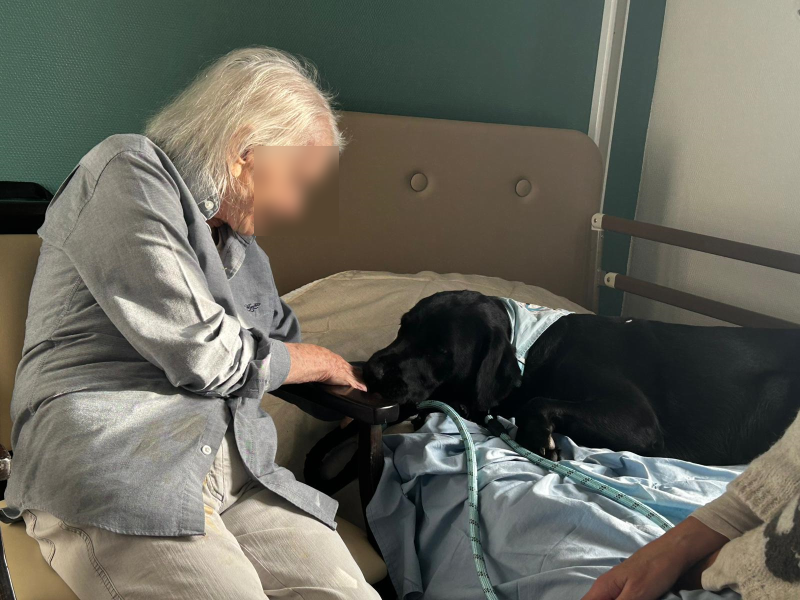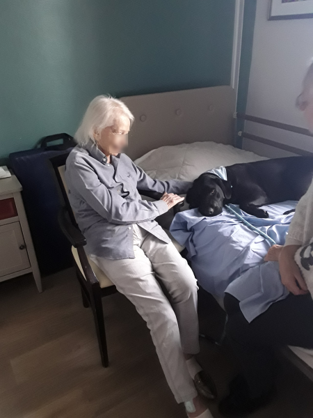 Uno, un labrador de deux ans, et Diane, sa maîtresse, sont enchantés de partager un moment simple avec leur chien et le résident, en étant complices et bienveillantes.