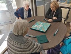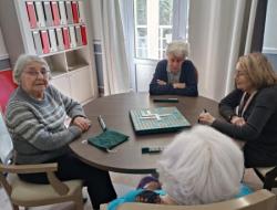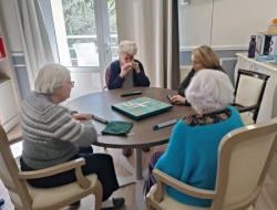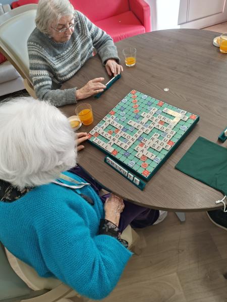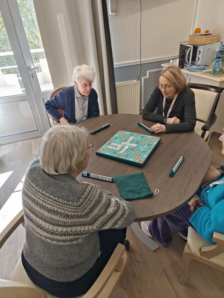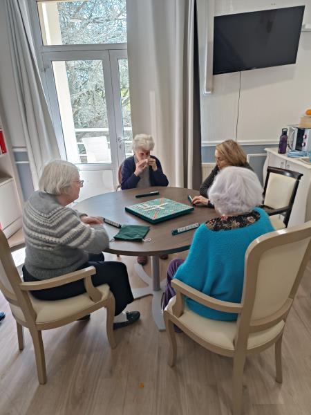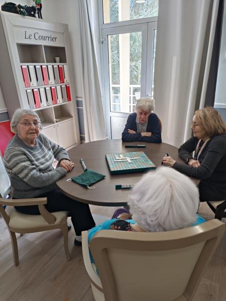 Dans le salon du premier étage hier après-midi, une partie de scrabble improvisée s'est déroulée.Un petit groupe de débutants s'est constitué et correspond à leur capacité à se stimuler mutuellement pour se donner le mot.
